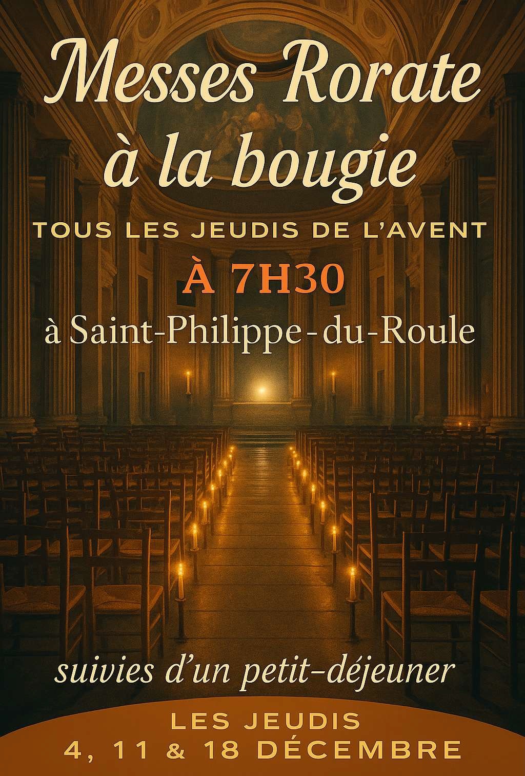 7h30 Messe de l’aube « Rorate » à la lumière des bougies, suivie d’un petit-déjeuner salle Baltard